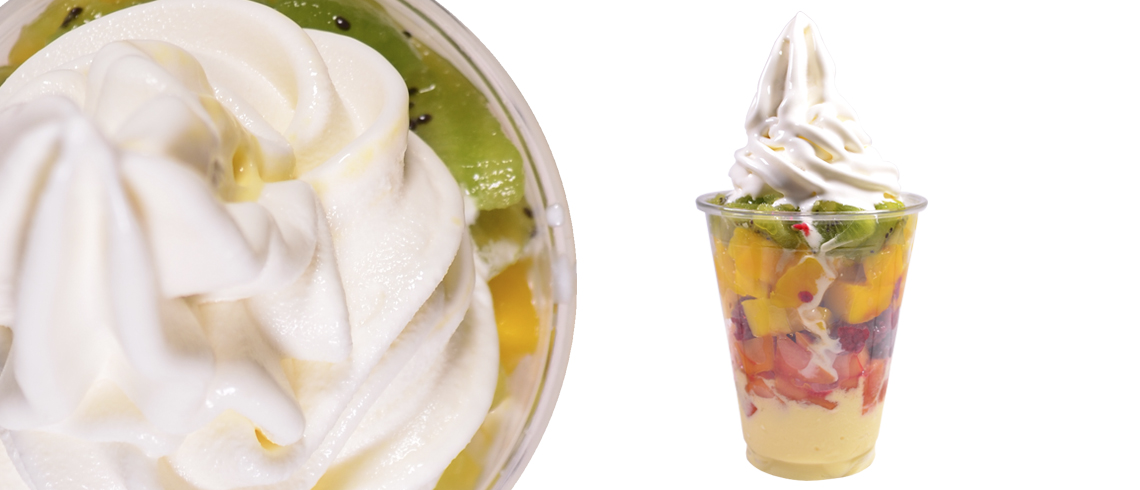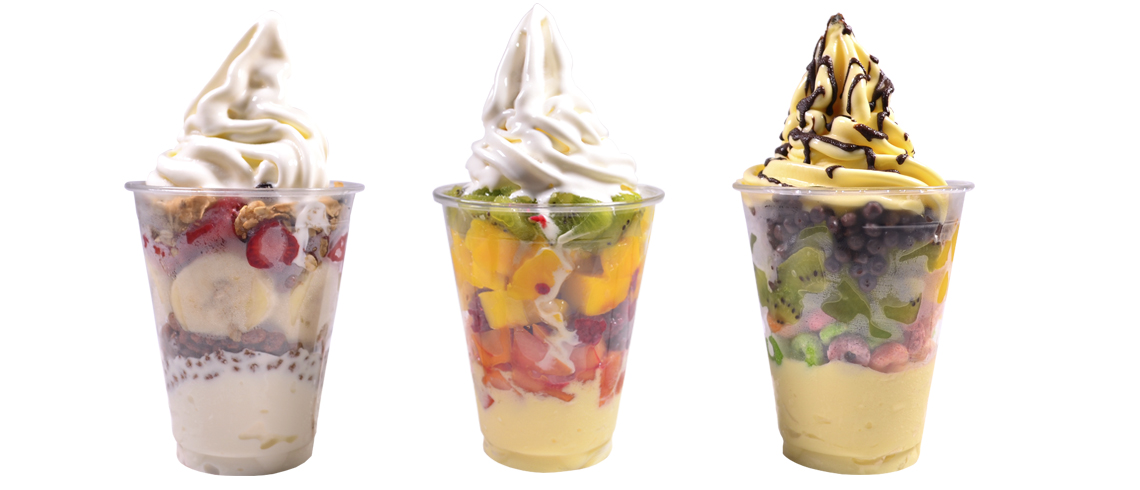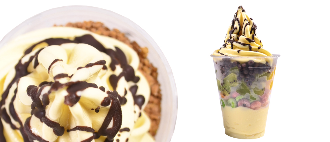 TOPPINGS DE FRUTAS –Mango, kiwi, piña, fresa, durazno, uvas pasas, mora, uvas, papaya, cereza, melón, mamei y bananos–.